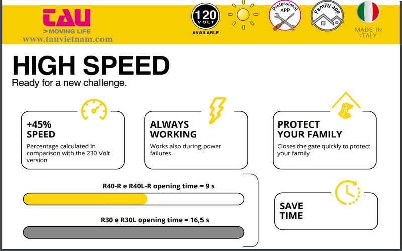 Motor Tau R40R-L được thiết kế với tần suất hoạt động cao, dùng để lắp đặt cho nhà ở, công ty, căn hộ… Với công suất động cơ 300W cho phép tải trọng cửa nặng 400kg/1 cánh và tốc độ đóng mở chỉ trong 9 giây cho góc 90*.